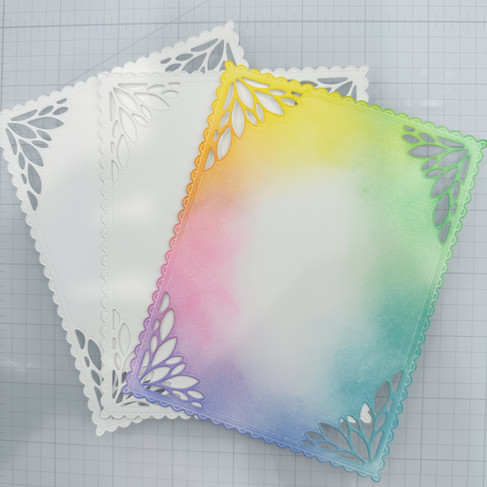 Use the medium-sized brush to gently "dust" the perimeter of the Spring Vine Layering die-cut with the rainbow of Distress Ink colors