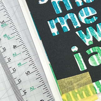 Use the T-square ruler to align the negative of the "You Made Me..." cardstock cut-out to the patterned card base. Secure the cut-out to the cardstock and craft mat with low-tack tape. The cutout will be used as a guide to space and align the free-standing sentiment letters.