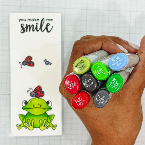 Stamp the frog, bow, and sentiment in Memento Tuxedo Black Ink and color with Copic Markers. (In the pics, I also stamped the crown but decided not use it)