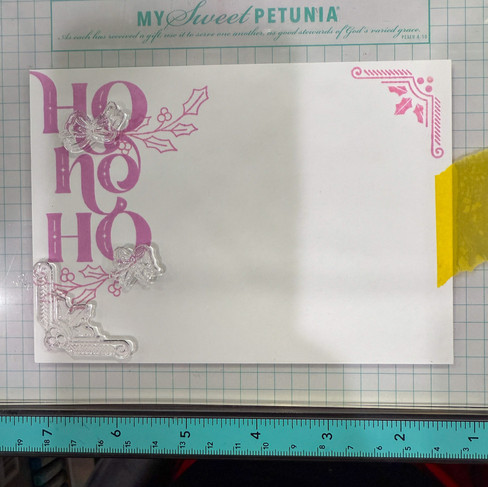 Start with stamping the largest elements first - the sentiment in Bubblegum and then adding the Holly Sprigs, corner decorations and bows.