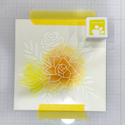 Use the Simon Small Blending Brushes and selected ink colors ink-blend the floral image through the stencil. The colors used are : Melon, Cantaloupe, Lemonade, Limelicious, Peony (not shown), Sherbet, and Pearlicious.